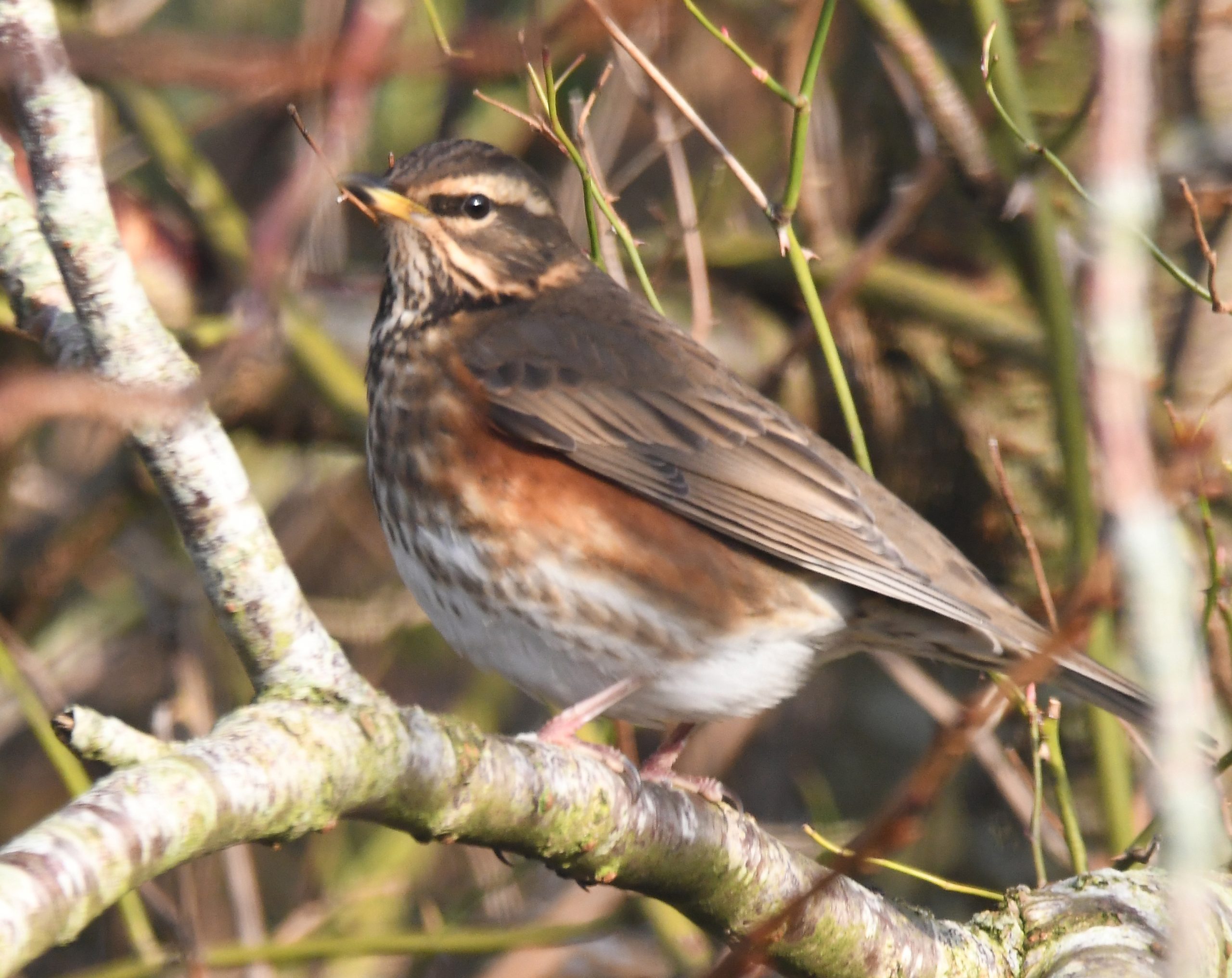 The Redwing is a small Thrush that visits the UK in the winter to feast on berry-laden bushes and trees. Redwings migrate at night and on clear evenings their “tsee” call may be heard overhead. They can often be seen in flocks with Fieldfares. A tiny population of Redwings breed in the UK but most of our visiting birds come from Iceland and Scandinavia.